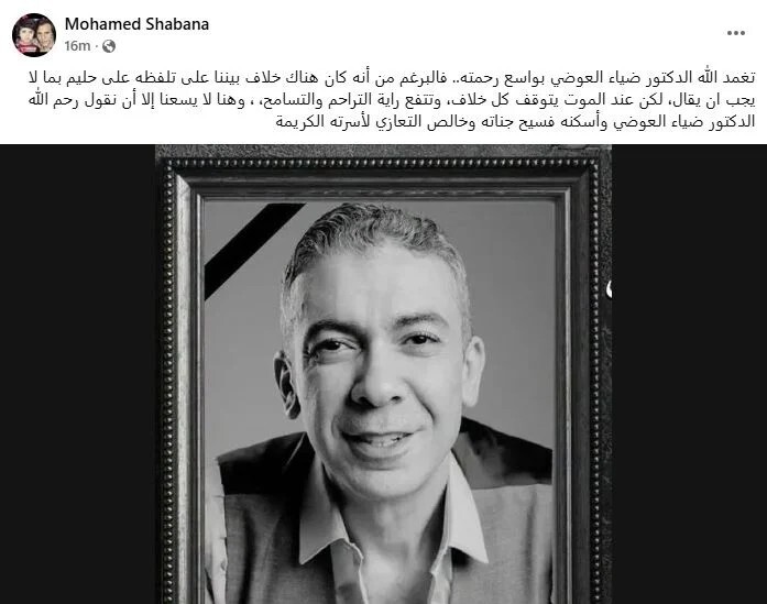 وأضاف شبانة: "وهنا لا يسعنا إلا أن نقول رحم الله الدكتور ضياء العوضي وأسكنه فسيح جناته، وخالص التعازي لأسرته الكريمة"، مؤكدًا أن مثل هذه اللحظات تفرض احترام قيمة الإنسان وتدعو إلى تجاوز أي خلافات سابقة.
